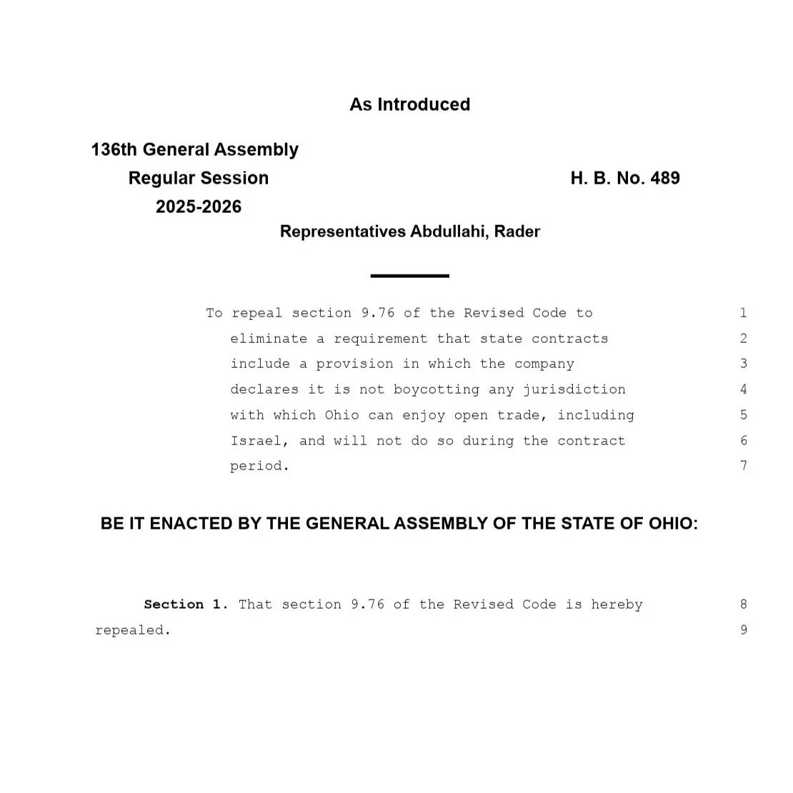 HB 489, introduced by Representatives Munira Abdullahi (Columbus) and Tristan Rader (Lakewood), seeks to repeal that 2016 law. The bill would return Ohio’s contracting process to its original standard — awarding contracts to the “lowest and best bidder” based on merit, not political beliefs.